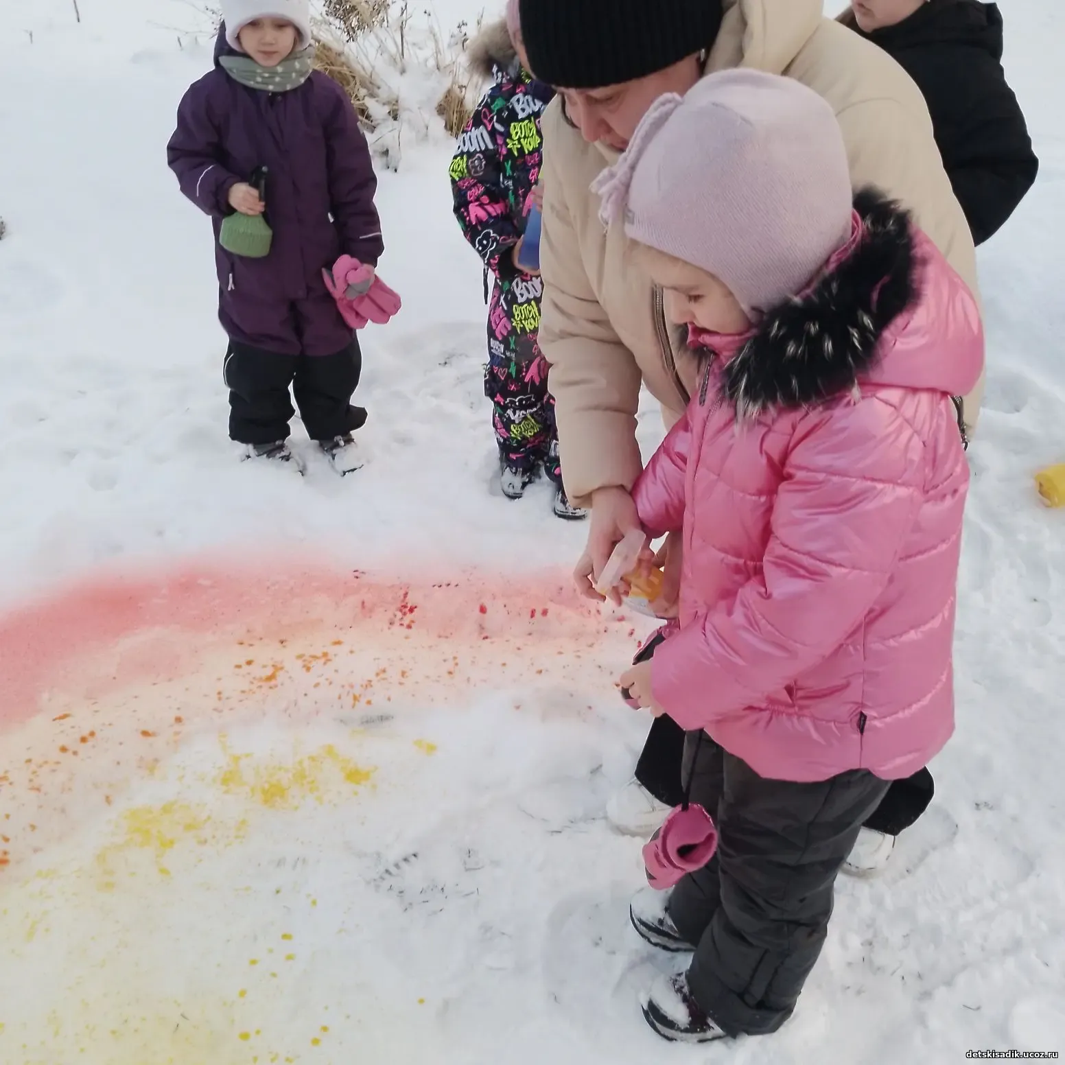 Используя яркие краски, дети наносили красные, оранжевые, жёлтые, зелёные, голубые, синие и фиолетовые полосы на белоснежное покрывало. Благодаря такому контрасту краски на снегу получилась настоящая радуга! Этот простой и веселый эксперимент помог детям увидеть, как свет и цвет взаимодействуют в природе.