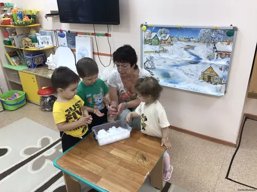 Малыши из группы «Капельки» погрузились в «Мир воды, льда и снега». Вместе со своими педагогами они играли в зимние игры, рассматривали снег на улице, определяли, что снег холодный, белый, пушистый, а также с ним можно играть: строить, насыпать в ведерки, лепить снежки. Педагоги изготовили искусственный снег из соды и воды, дети с удовольствием брали его в руки, лепили из него "снежные пирожки", пересыпали из руки в руку.